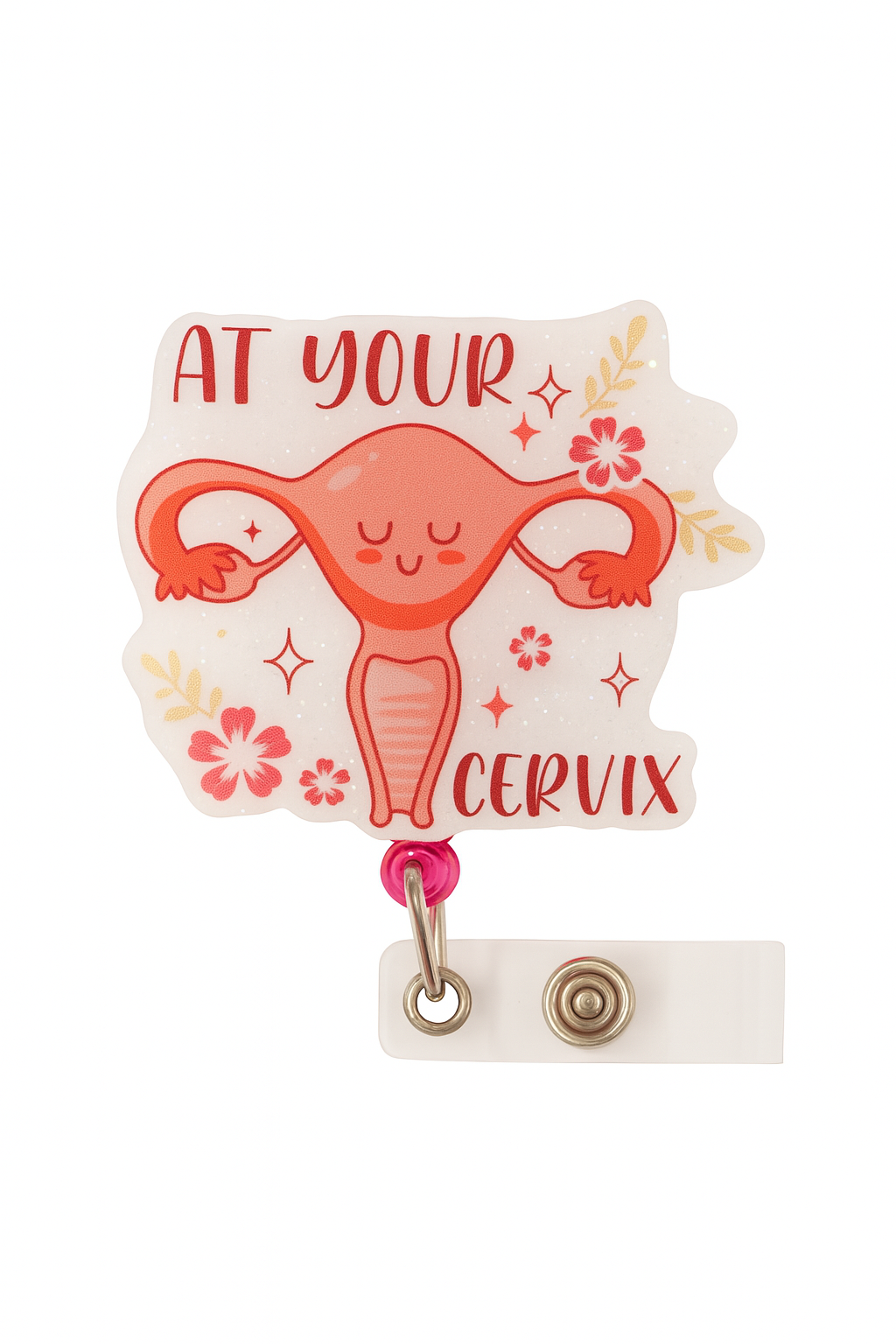 Add a sparkly dose of humor to your scrubs with this “At Your Cervix” badge reel! Featuring a smiling uterus illustration surrounded by pink flowers and glittery charm, this retractable ID holder is perfect for OB/GYNs, nurses, midwives, and women’s health professionals. With a strong clip and vibrant pink accent bead, it’s both playful and practical—sure to get compliments on every shift!