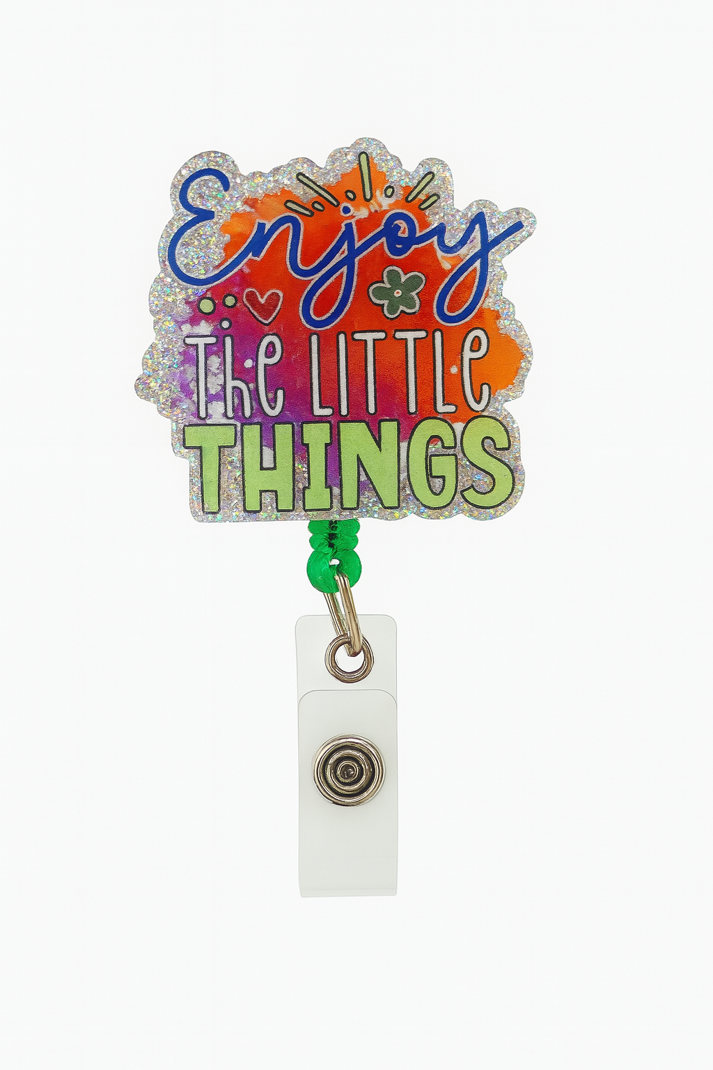 Brighten your day with this colorful "Enjoy the Little Things" badge reel! Featuring vibrant lettering, playful doodles, and a glittery finish, this retractable ID holder is the perfect reminder to appreciate life's small joys. With a secure clip and clear snap strap, it's both stylish and functional—ideal for nurses, teachers, office workers, or anyone who wears an ID badge. Add a pop of positivity to your daily routine!
