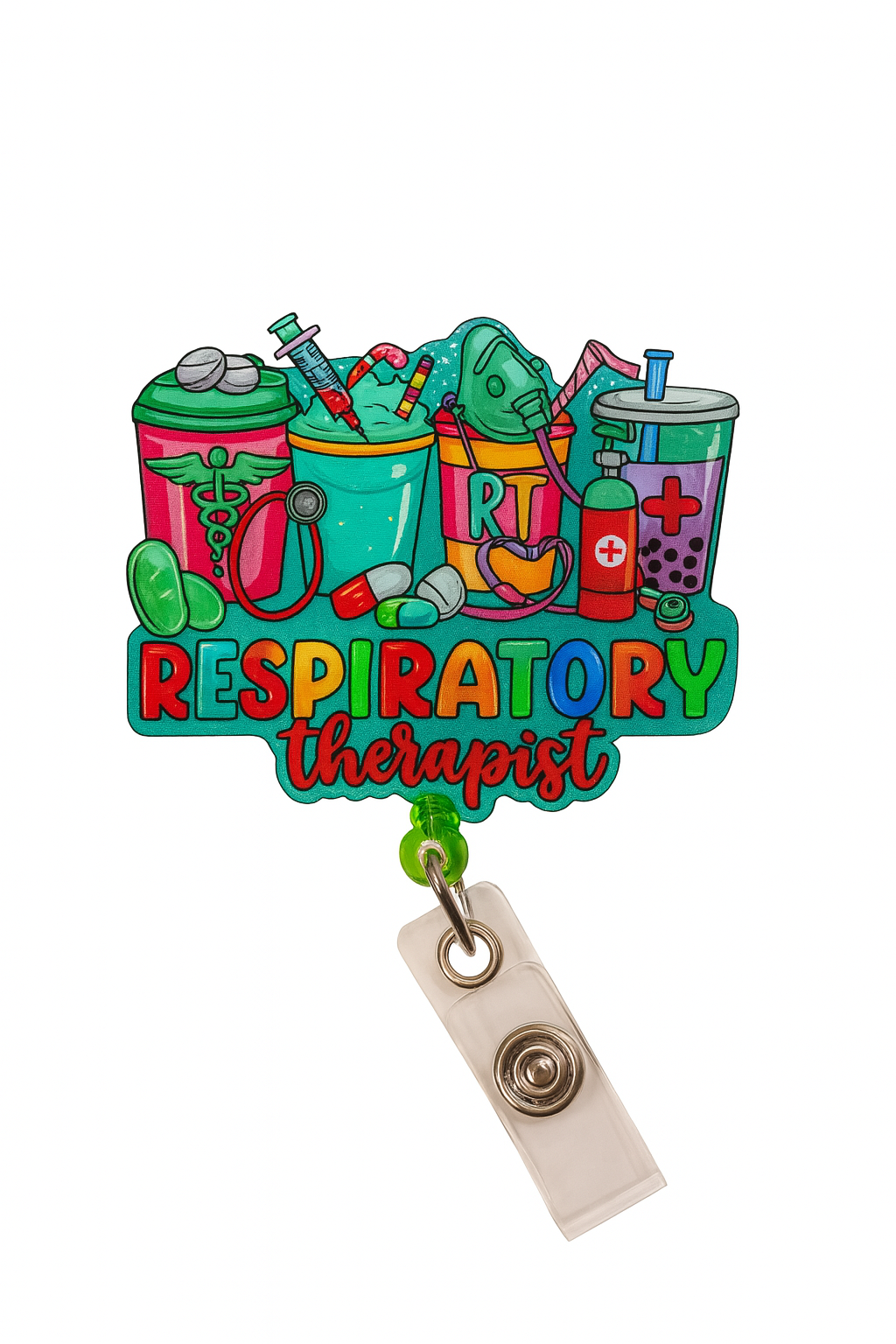 “Respiratory Therapist” in bold, cheerful lettering. The sturdy clip and retractable cord make it a practical and stylish accessory for RTs in hospitals, clinics, or respiratory therapy programs. A perfect gift for any hardworking respiratory hero!