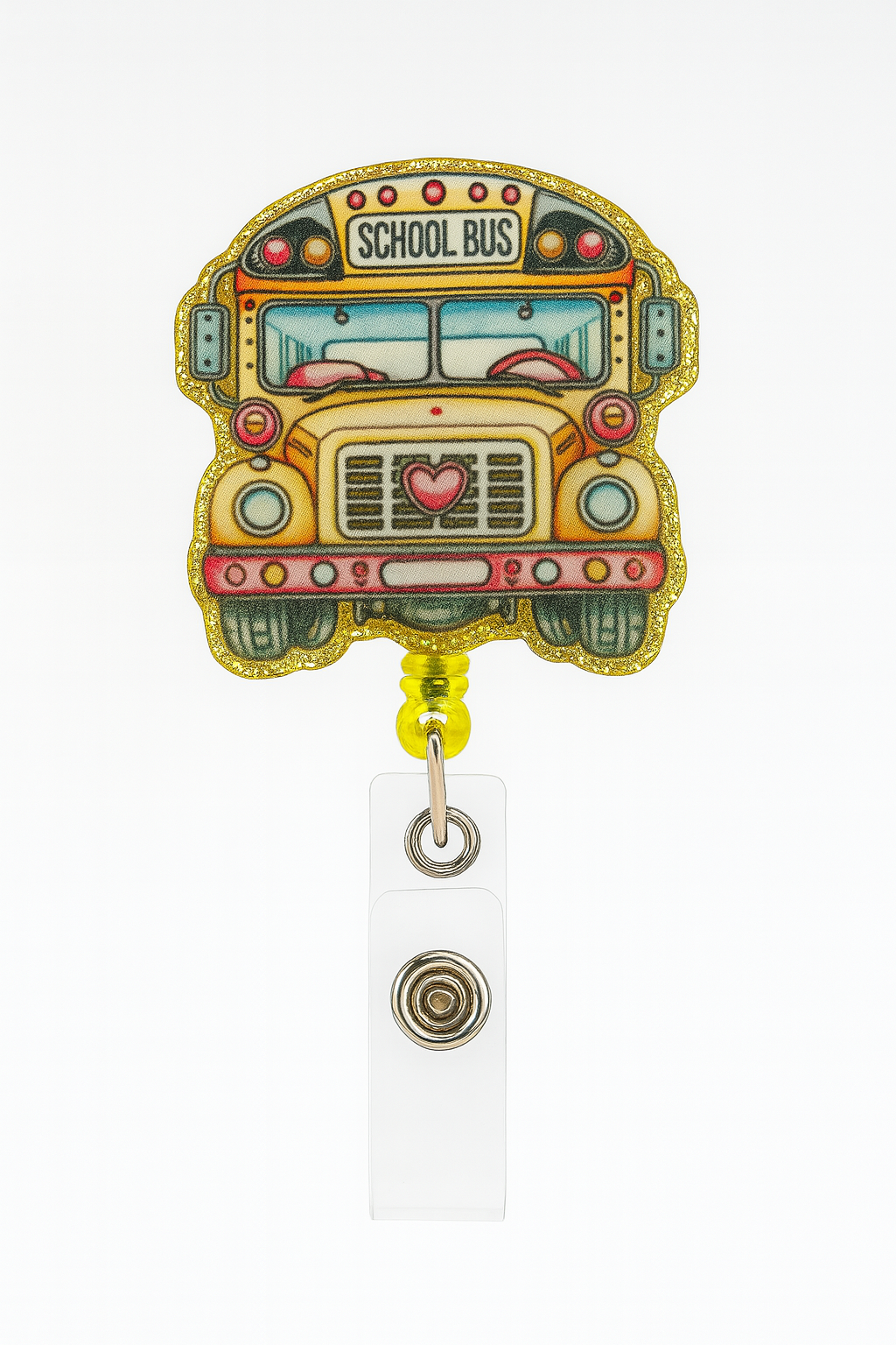 Featuring a vibrant yellow bus with heart accents, glittery details, and a friendly cartoon design, it’s perfect for teachers, bus drivers, and school staff. The retractable reel includes a sturdy clip and a clear snap strap for secure, easy badge access. A fun and functional accessory for anyone who keeps education rolling!